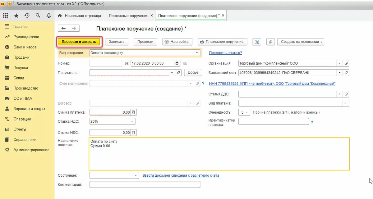 Здесь заполняем основные поля аналогично заполнению платежки: