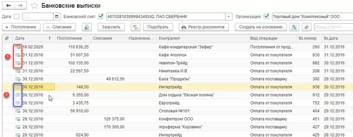 Документы в журнале «Банковской выписки», отмеченные зеленым флажком, проведены и разнесены.