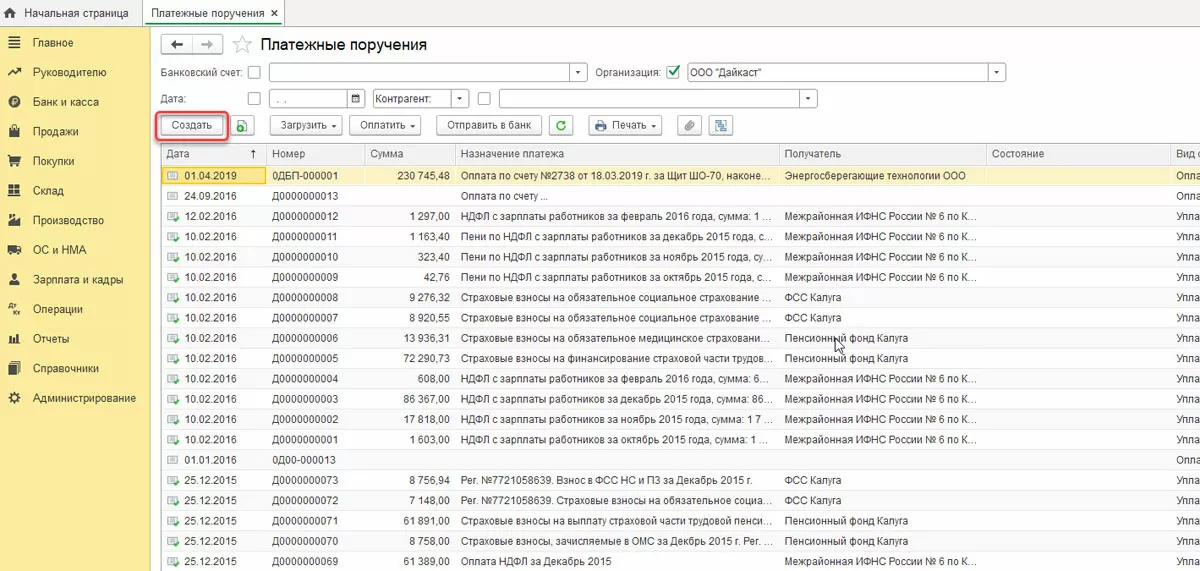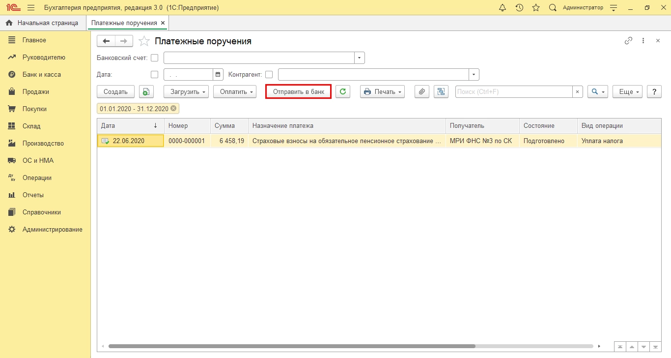 Шаг 1. Перейдите в журнал «Платежные поручения» и нажмите «Отправить в банк».