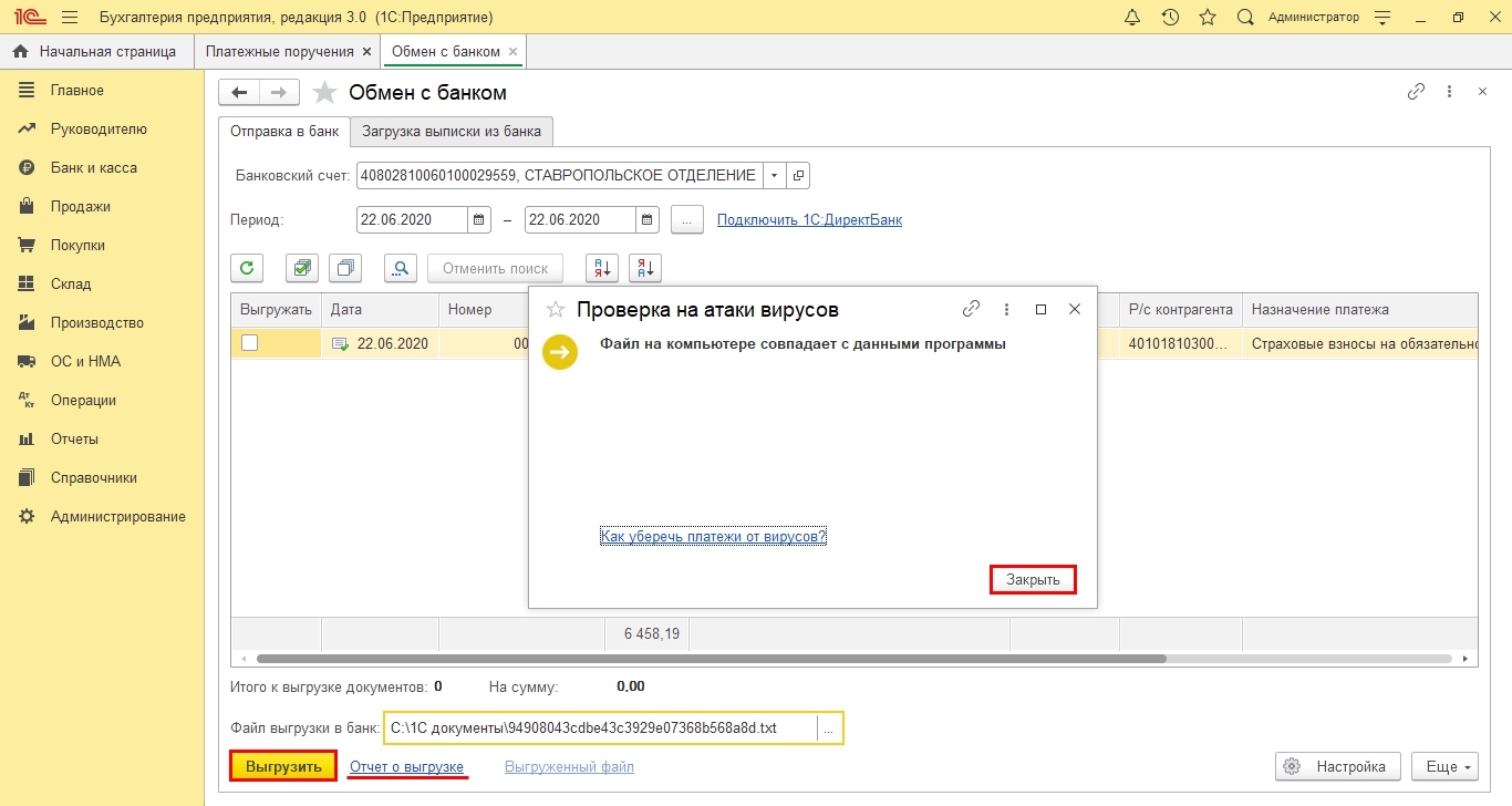 В процессе выгрузки файла 1С проверяет его на вирусы.