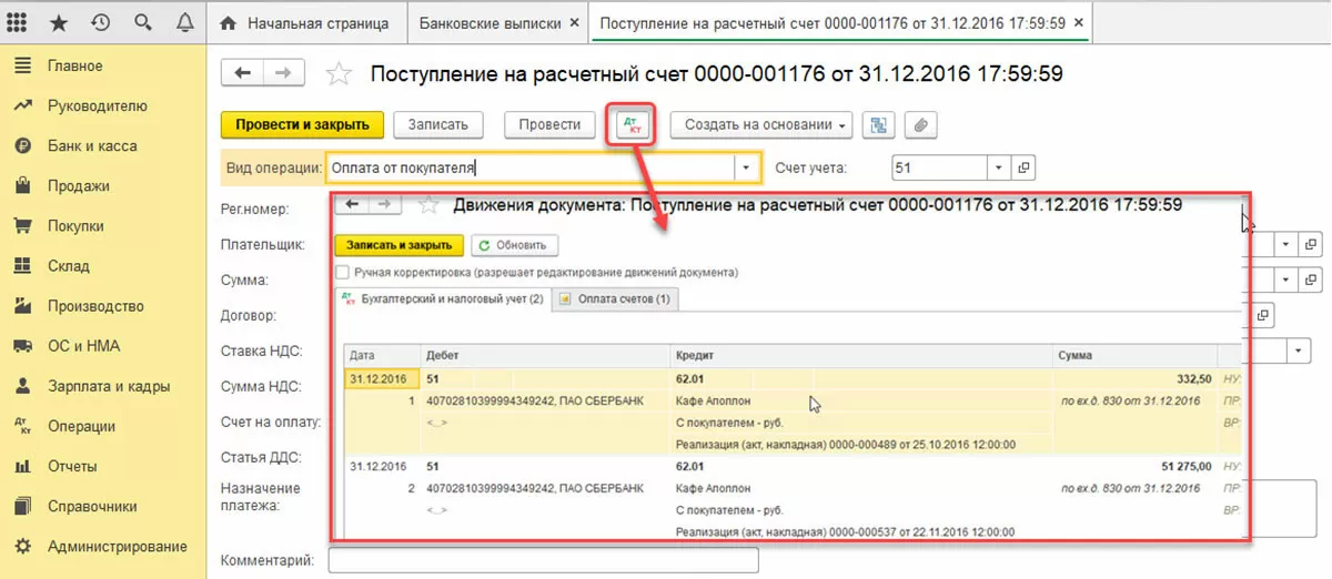 В документах «Поступление на расчетный счет» и «Списание с расчетного счета» смотрим проводки и проверяем корректность их отображения через кнопку «ДтКт». В открывшемся окне «Движения документа» отобразятся проводки.