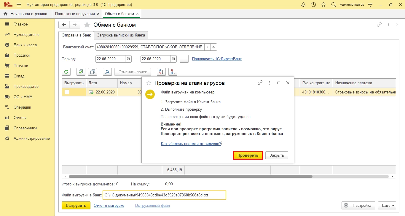 Напротив каждого платежки, которую мы хотим оплатить, проставляем «Флаг» и нажимаем на кнопку «Выгрузить». Это приведет к открытию окна «Проверка на атаки вируса», где мы жмем «Проверить».