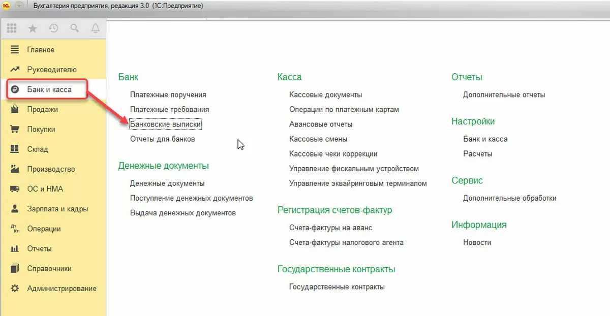 Первый вариант – создание вручную через блок «Банк и касса–Банковские выписки».