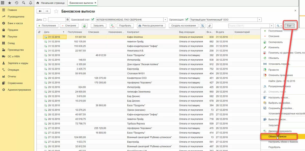 Настроим интеграцию 1С с Fintech API, инфраструктура Сбербанка доступна прямо в 1С:Бухгалтерия!Перейдем к отправке документов в банк. Находясь в журнале «Банковские выписки», нажимаем «ЕЩЕ–Обмен с банком».