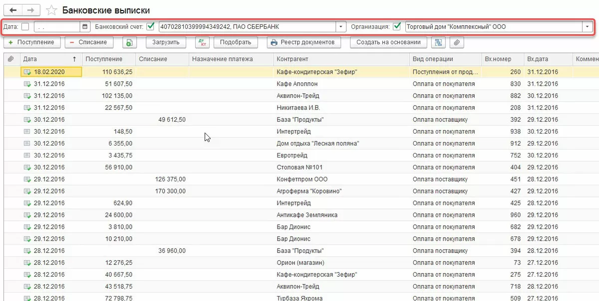 В открывшемся окне появится журнал с платежками, где можно, настроив соответствующий отбор, отфильтровать необходимые документы, например, вывести список по определенной организации, банковскому счету, дате или контрагенту.
