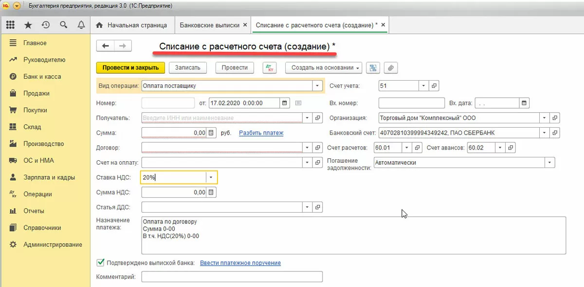Платежка не делает никаких проводок в 1С 8.3, их формирует «Списание с р/сч», которое также можно создать на основе сформированной нами платежки, или вручную, через создание нового списания.