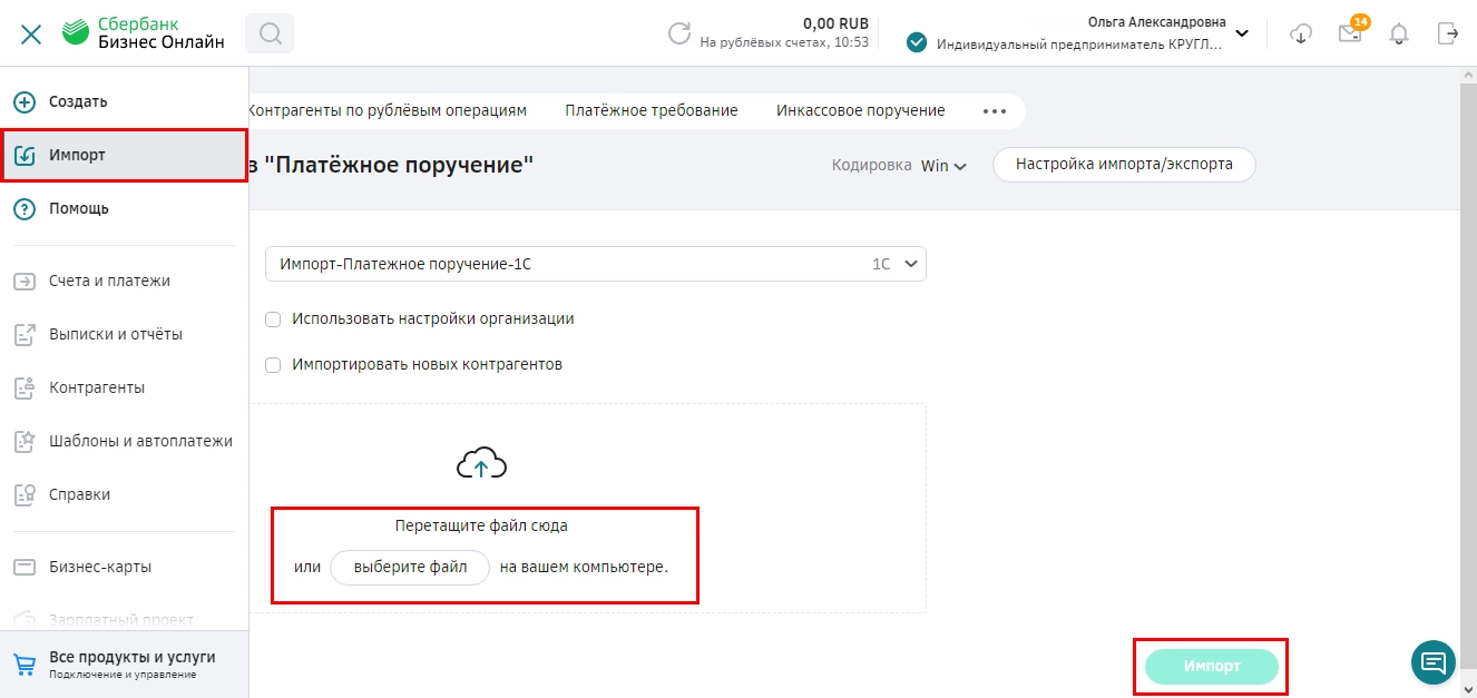 Шаг 8. В меню найдите раздел «Импорт» и укажите файл с платежками. По нажатию кнопки «Импорт» произойдет автоматическая загрузка платежки в систему.Загрузка выписки в 1С 8.3