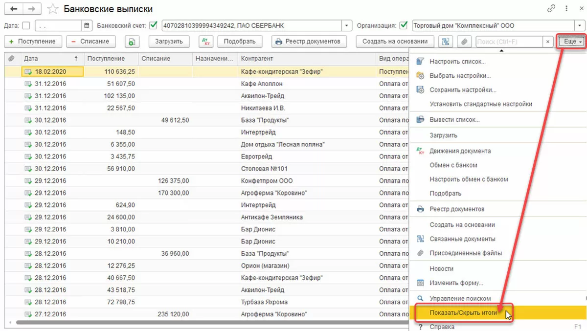 Если в журнале банковской выписки надо отобразить начальные остатки на начало и конец дня, а также итоговые суммы поступления и списание на заданную дату, нажимаем «ЕЩЕ–Показать/Скрыть итоги».