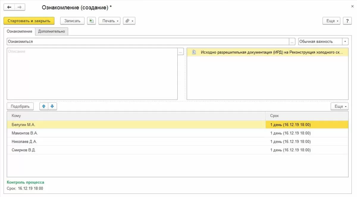 - Ознакомление. Функцию используют для отправки конкретному пользователю или нескольким пользователям сразу документов или других объектов системы для осведомления и изучения.