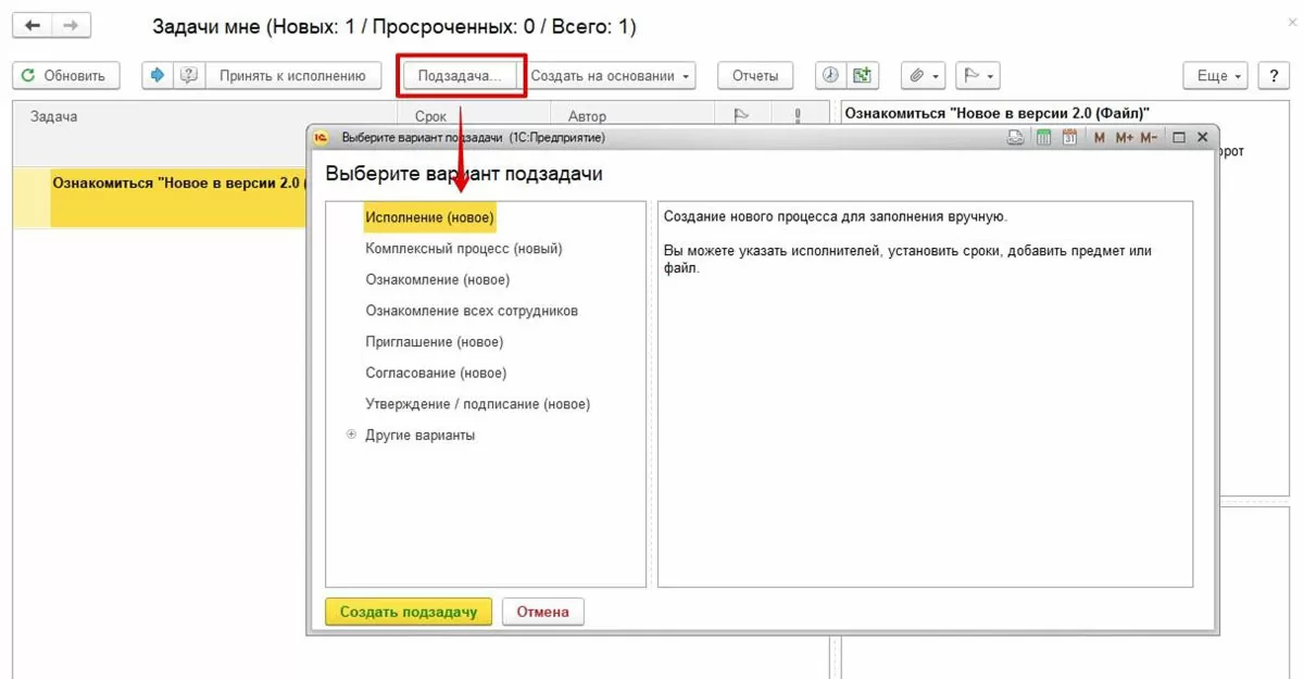 - В качестве подзадачи – если необходимо детализировать работу, создать дополнительную задачу на основании основного процесса, привлечь дополнительных согласующих или исполнителей.