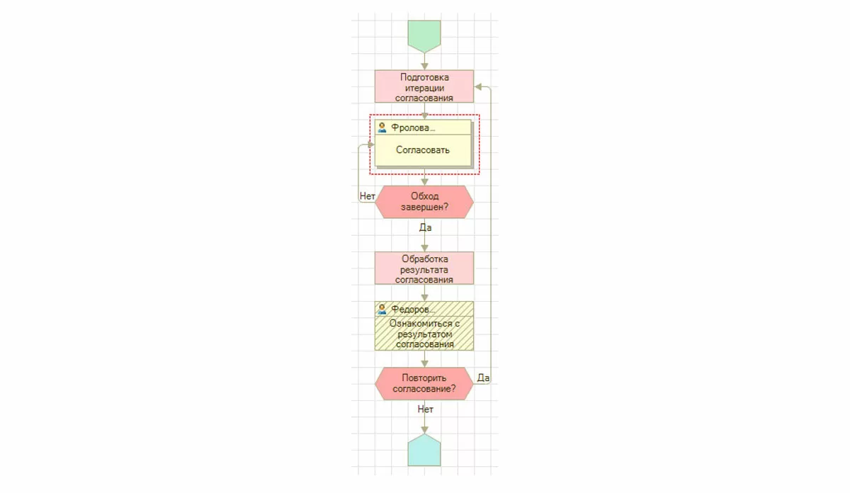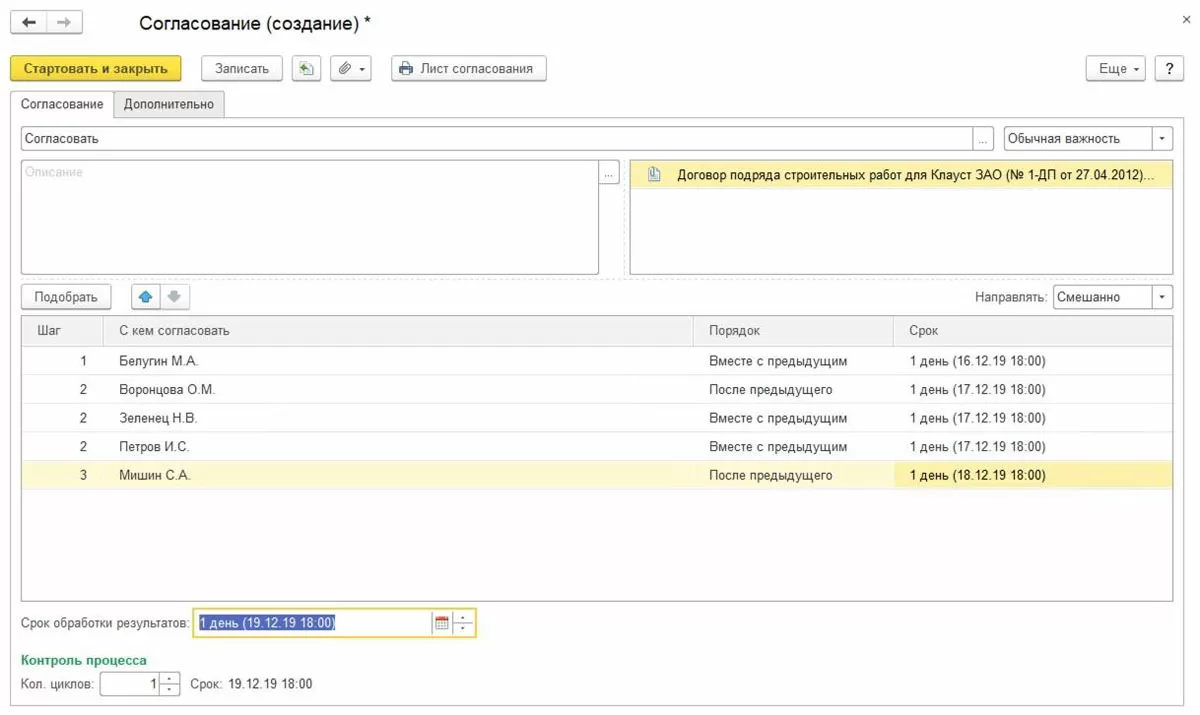 В рамках настройки заложено понятие комплексного процесса в «1С:Документооборот». Этот процесс подразумевает настройку маршрута обработки документа практически любой сложности, состоящего из произвольной последовательности элементарных процессов, условий маршрутизации и различных скриптов.