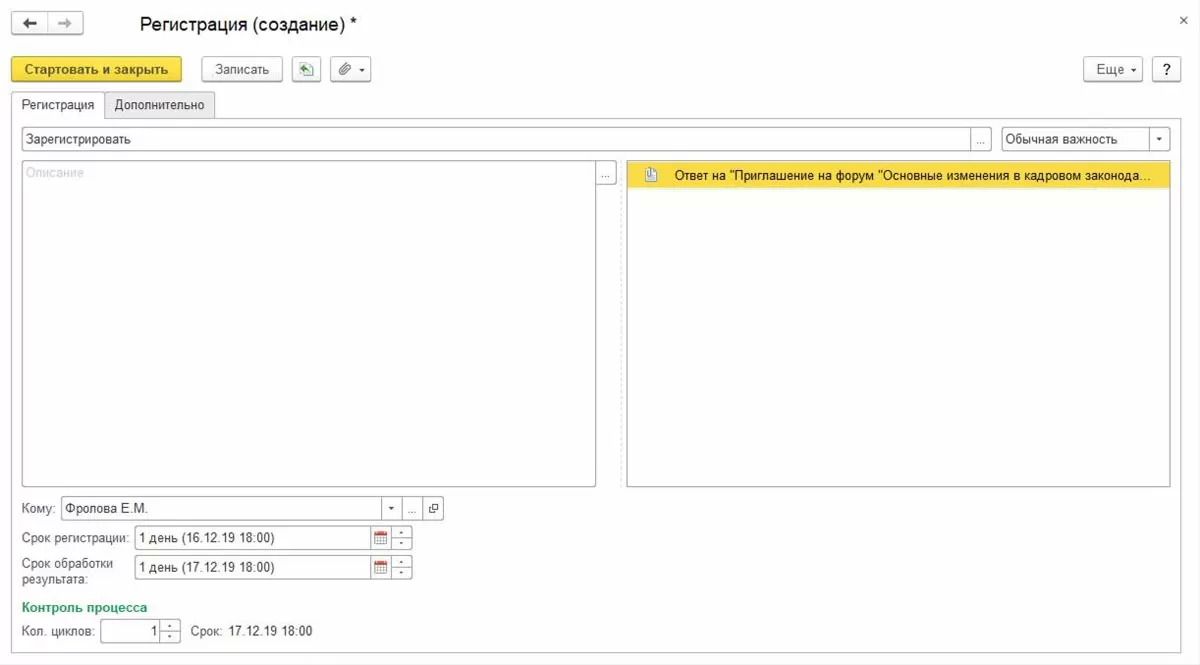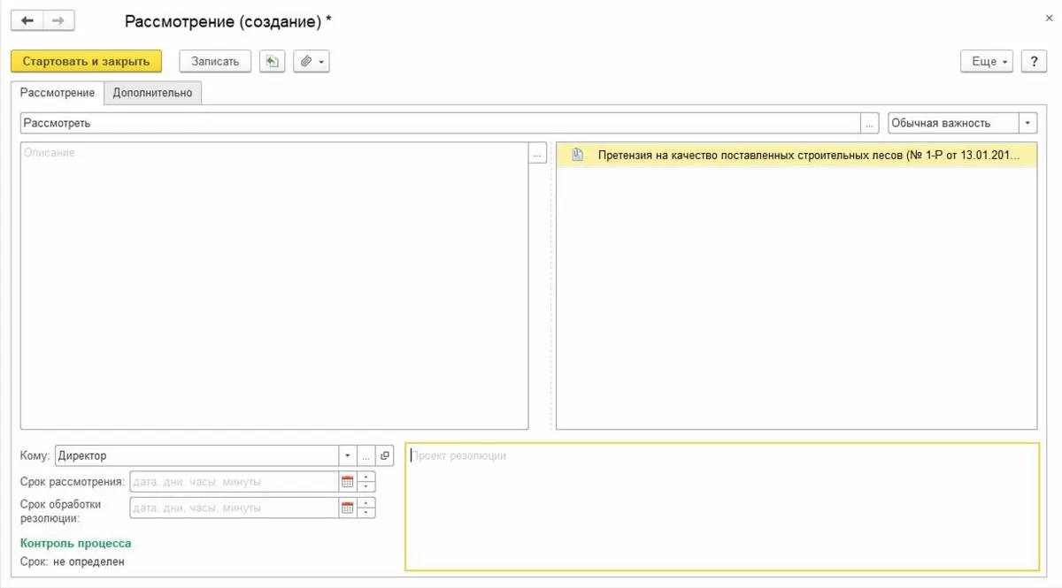 - Процесс рассмотрения необходим для принятия решения о дальнейшей обработке в 1С:ДО документа, как правило, входящего или внутреннего (служебные записки).