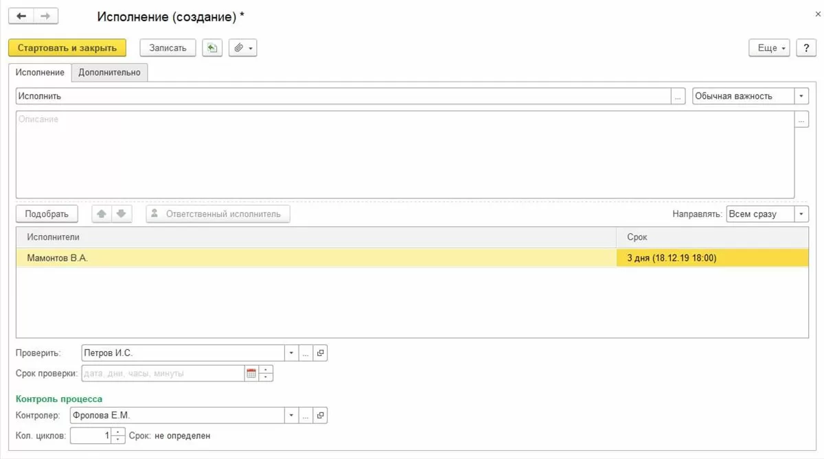 - Исполнение. Как следует из названия, данная задача требует исполнения необходимых действий. Ее адресуют пользователю или одновременно нескольким пользователям. При этом можно настроить функции контроля и задать возможность проверки результатов исполнения. Есть возможность назначить ответственного исполнителя.