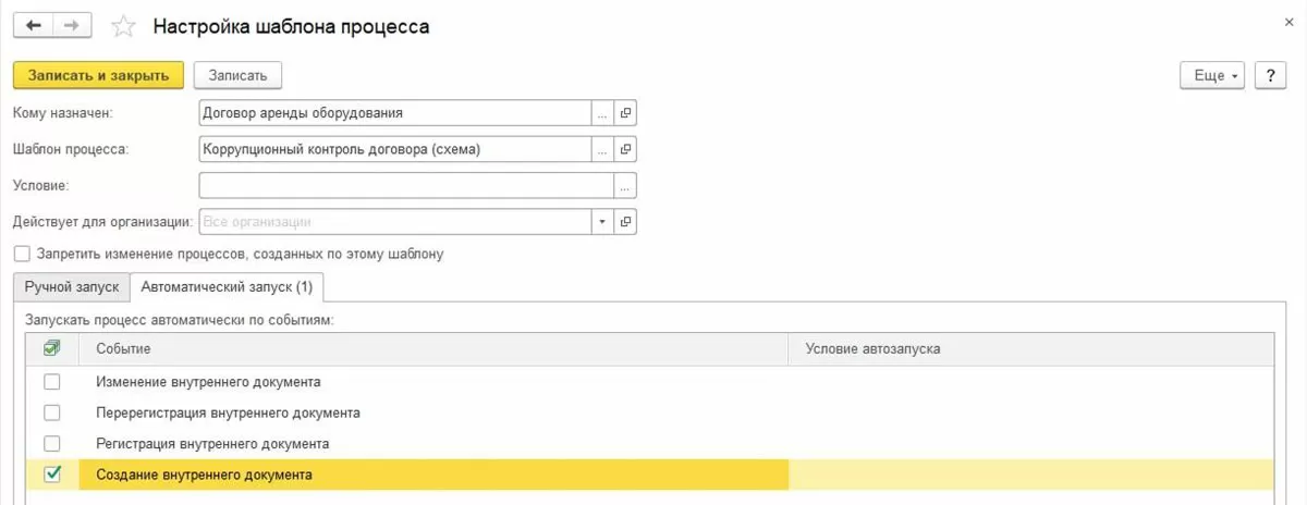 Новый бизнес-процесс, связанный с определенным документом, может быть создан на основании этого документа.