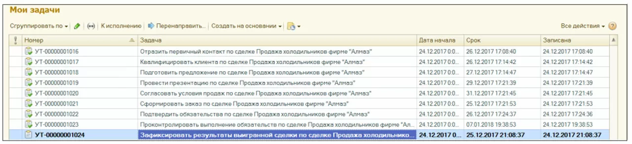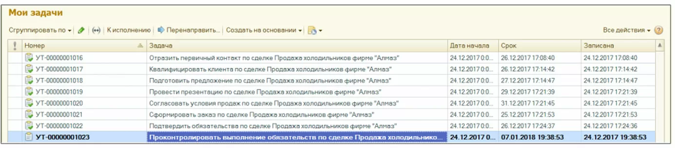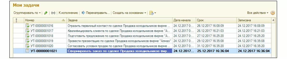 Последовательно пройти следующие два этапа: «Провести презентацию по сделке» (презентация товаров) и «Согласовать условия продаж по сделке» (здесь есть возможность скорректировать коммерческое предложение), после чего список задач будет, как на рисунке ниже, и текущей задачей станет «Сформировать заказ по сделке» .