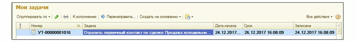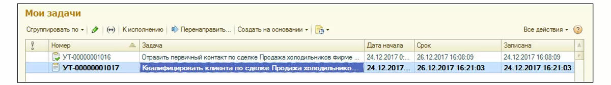 Далее по правой кнопке мыши в списке задач на этапе «Отразить первичный контакт по сделке» установить статус «Выполнено» (или кнопкой «Выполнено» в форме задачи), после чего автоматически будет создана новая задача «Квалифицировать клиента по сделке» . Эту задачу нужно заполнить и выполнить по аналогии с предыдущей.
