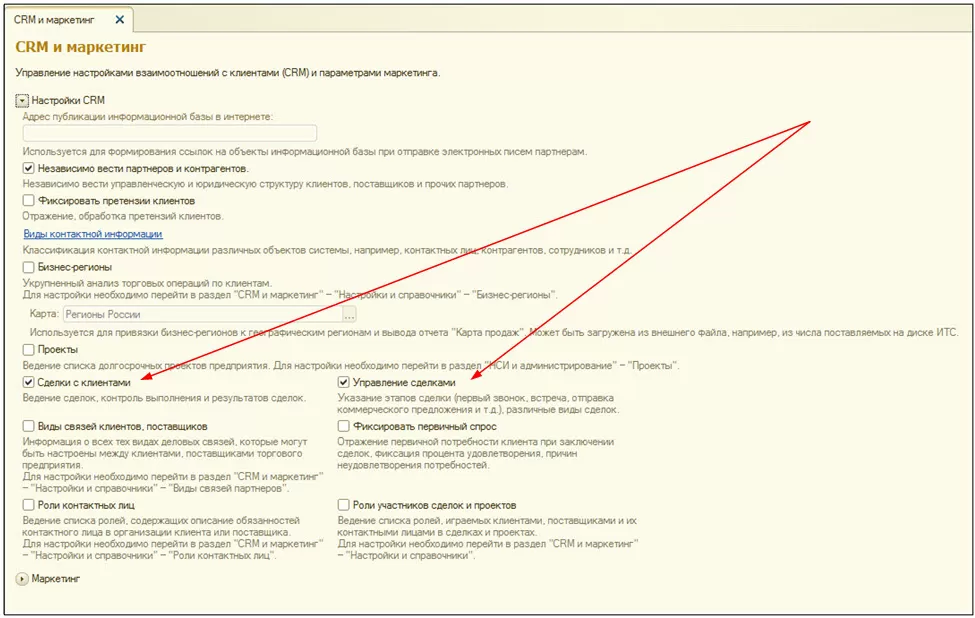 Для запуска бизнес-процесса «Типовая продажа» требуется создание сделки с клиентом, поэтому сначала нужно установить или проверить настройки в соответствующем разделе нормативно-справочной информации (НСИ). Для этого в основном меню необходимо перейти в раздел «НСИ и администрирование – СRM и маркетинг – Настройка CRM» и последовательно установить флажки «Сделки с клиентами» и «Управление сделками».