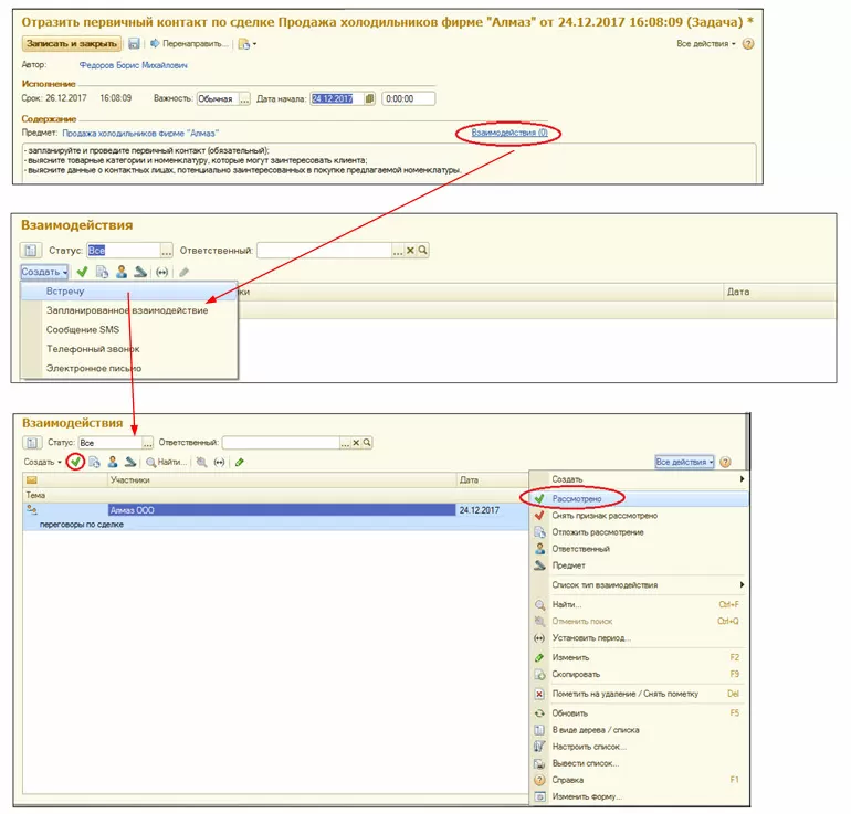 Далее открыть новую задачу и заполнить реквизиты: дата начала и важность. Для выполнения этого этапа требуется создания первичного взаимодействия по сделке: перейти по ссылке «Взаимодействие…» и выбрать из списка нужный вариант (заполнение очень простое). Важно перед сохранением документа установить флаг «Рассмотрено».