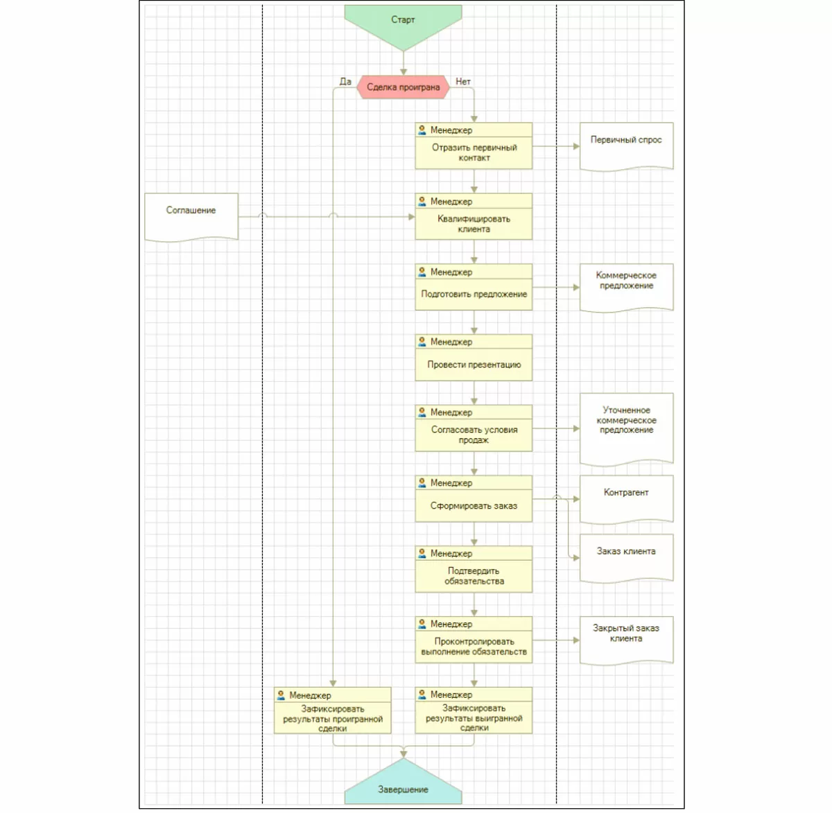 Карта начинается с пункта Старт, без которого бизнес-процесс не может быть начат (стартован). Точек старта может быть несколько, но в нашем примере условие выбора появляется после него, и продолжение маршрута зависит от результата заключения сделки.