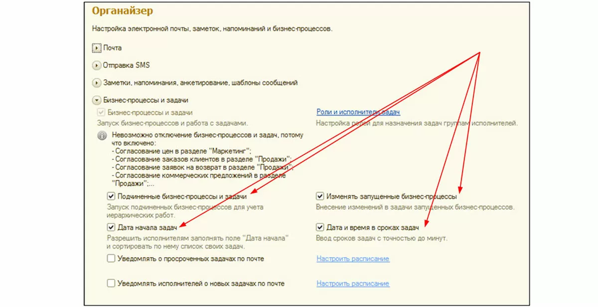 В данном примере в разделе «НСИ и администрирование – Органайзер» имеется еще ряд настроек для бизнес-процесса, также отмеченных флажками: