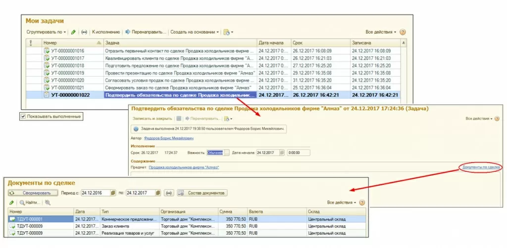 Новой задачей станет этап «Подтвердить обязательства по сделке» . Для подтверждения этой задачи нужно наличие пакета документов «Коммерческое предложение», «Заказ клиента», «Реализация товаров и услуг» . В случае предоплаты еще и документ, подтверждающий оплату по сделке.