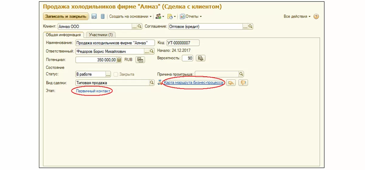 В разделе «CRM и маркетинг – Сделки с клиентами» в списке сделок нужно создать новую сделку и заполнить необходимые поля: