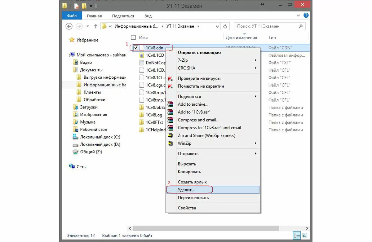 В окне проводника найдите в списке файлов файл 1Сv8.cdn, нажмите на нем правой кнопкой мыши, выберите «Удалить», как показано на предыдущем рисунке.