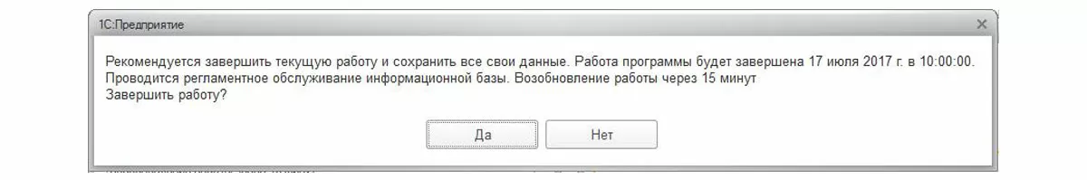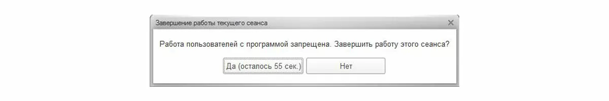 До момента начала блокировки активные пользователи будут получать «вежливые» напоминания о необходимости завершения работы. В данном диалоге по таймауту срабатывает «Да», поэтому отсутствующие на рабочем месте пользователи успешно выйдут из сеанса 1С.