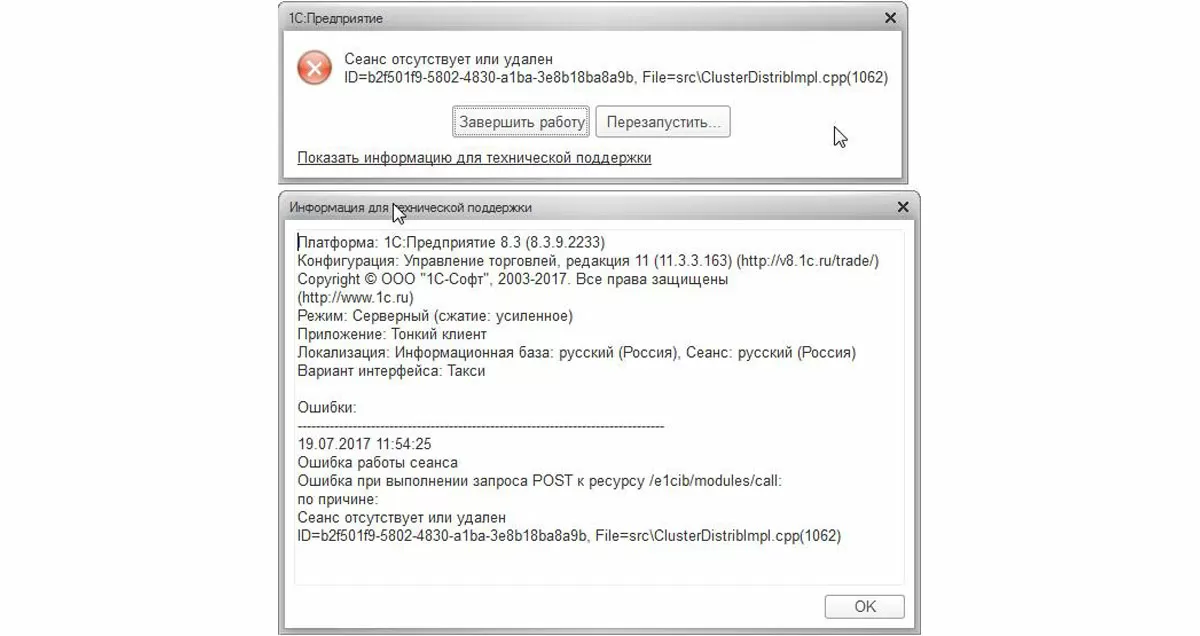 Сервер приложений 1С имеет возможность удалить сеанс несмотря на режим модального диалога. Интерфейс 1С и модальный диалог останутся у пользователя на экране, создавая видимость незавершенного сеанса, но на самом деле сеанс будет удален, а соединение с ИБ будет своевременно разорвано. При попытке продолжить работу пользователь увидит сообщение об ошибке «Сеанс отсутствует или удален» или «Сеанс работы завершен Администратором» в зависимости от нюансов.