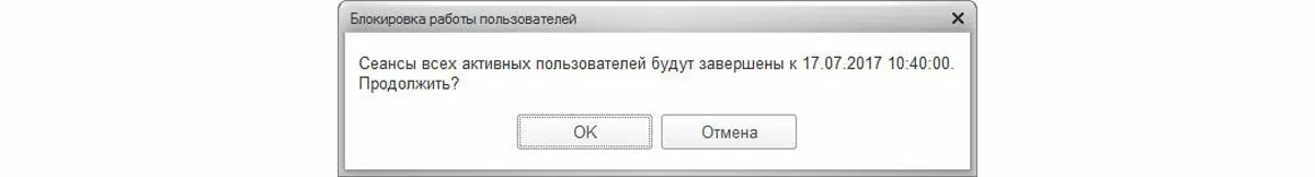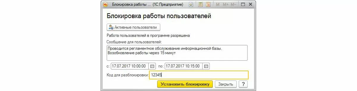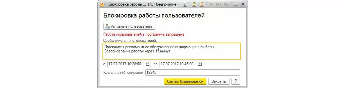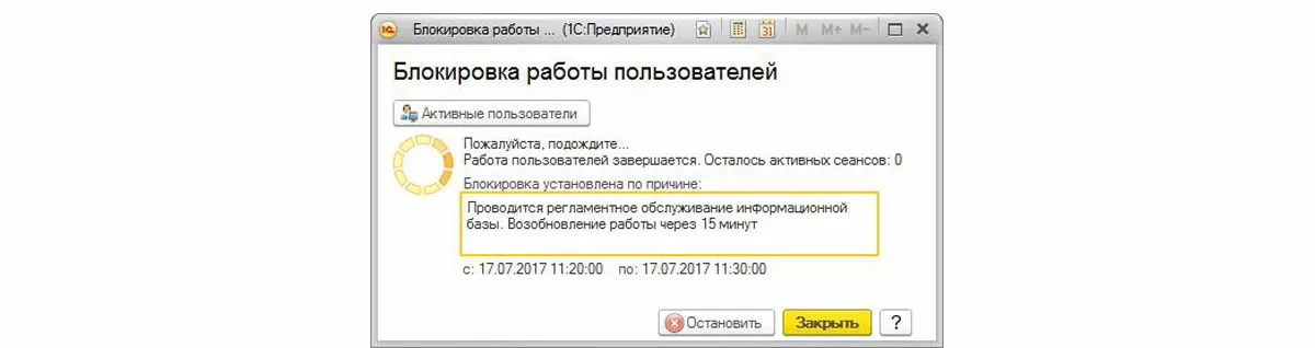 После установки блокировки из диалога лучше не выходить, т.к. при повторном входе в этот диалог до начала блокировки всплывает не соответствующее действительности сообщение о том, что блокировка уже установлена (правда только наполовину), активных сеансов ноль (неправда). При этом продолжается процесс завершения работы пользователей (противоречит нулю активных сеансов + не совсем так, т.к. пользователи «сами себя завершают»). Хотя код блокировки работы пользователей не идеален, в конце концов, это не помешает установить блокировку и завершить активные сеансы, однако дезориентирует Администратора информационной базы.