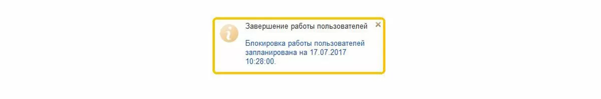 В правом нижнем углу будет выдано сообщение о том, что запланирована блокировка работы пользователей. Данное сообщение увидите только вы.