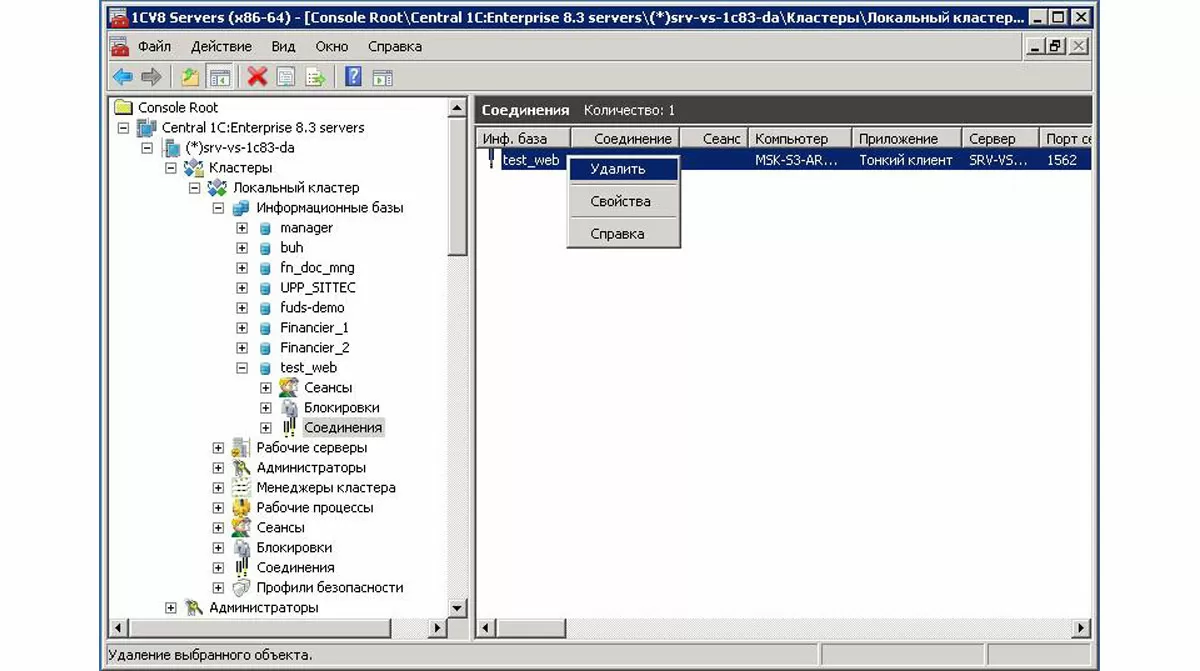 В узле «Соединения» информационной базы, в правой части экрана можно удалить имеющиеся соединения.