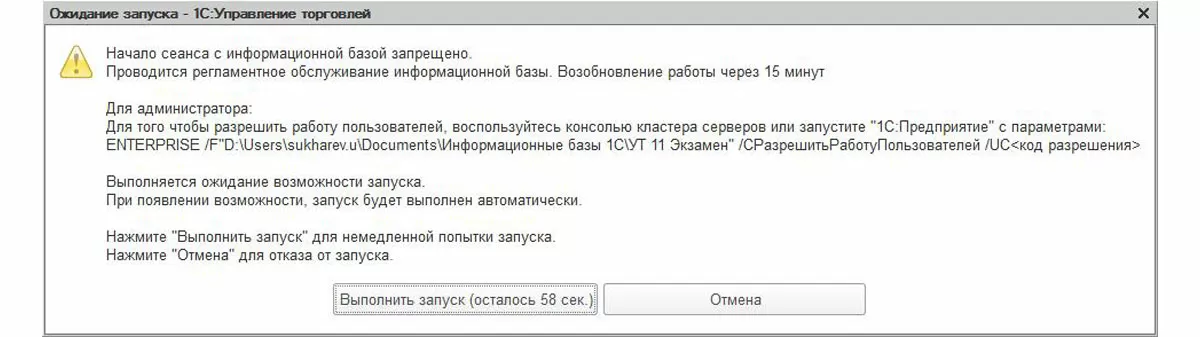 Пользователь файловой ИБ, решивший, например, удалить документ, а затем пойти на обед, оставив на экране диалог «Пометить документ на удаление?», будет держать открытым соединение с информационной базой. Конечно, его сеанс завершится после обеда, после того, как он ответит «Да» или «Нет», но до этого момента вы будете видеть, что есть активные пользователи. При этом инициатор блокировки увидит сообщение: