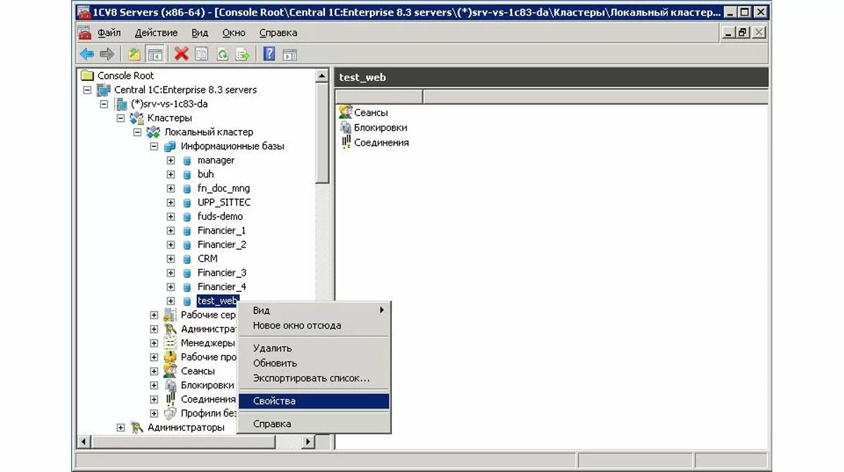 - Запустите оснастку, разверните дерево до узла с вашей информационной базой;