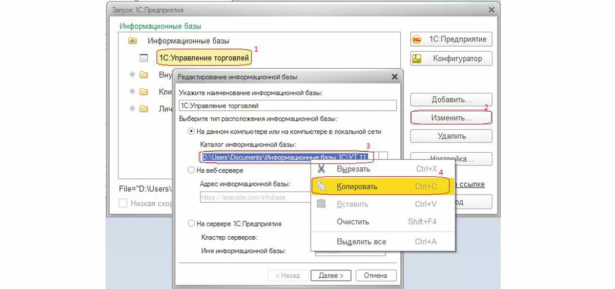 Если вы видите, что информационная база расположена на данном компьютере или в локальной сети — мой опыт не подвел – база файловая, и мы все делаем правильно. Скопируйте этот путь (цифры 3 и 4).