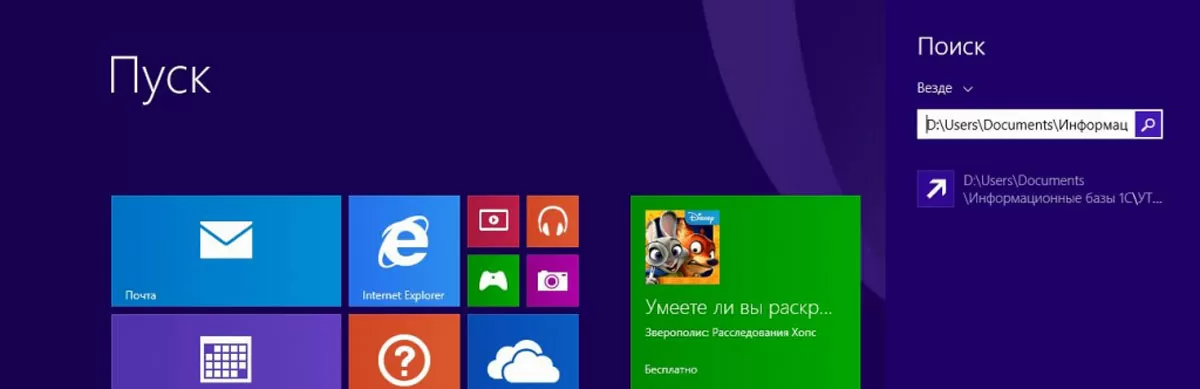 - У вас Windows 8 или Windows 10. Нажмите Пуск, в правом верхнем углу нажмите на Лупу, вставьте ранее скопированное расположение информационной базы, нажмите Enter. Откроется Проводник.