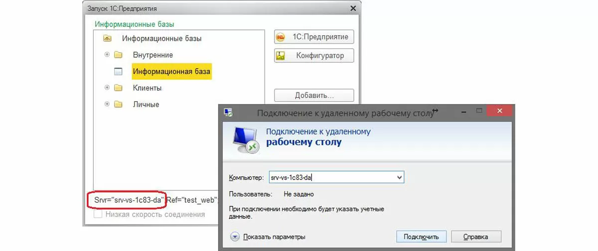 - Подключитесь по RDP к серверу, который указан в строке Srvr=… используя свой доменный логин и пароль. При невозможности подключения попросите системного администратора добавить вас в группу пользователей удаленного рабочего стола. (В случае отказа в таких правах – разверните и настройте на рабочей станции оснастку «Администрирование серверов предприятия 1С»);