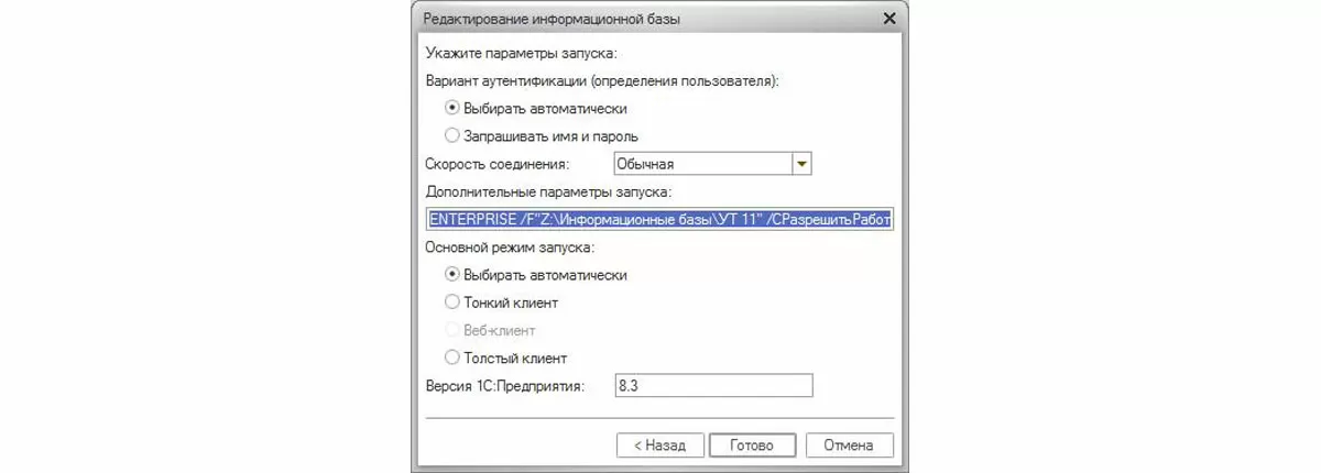 ENTERPRISE /F"Z:\Обмен\УТ 11" /CРазрешитьРаботуПользователей /UC12345