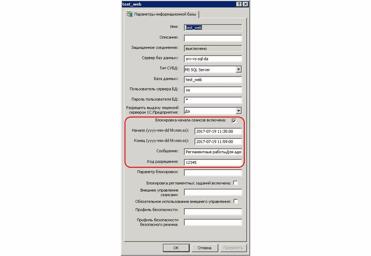 Код для разблокировки – однократный «пароль» на запуск «с нуля», вопреки установленной блокировке, который может понадобиться в некоторых случаях (будет сказано далее). Вводить и запоминать обязательно. Этот параметр в случае SQL-варианта информационной базы виден в оснастке «Администрирование серверов 1С предприятия» и называется там «Код разрешения».