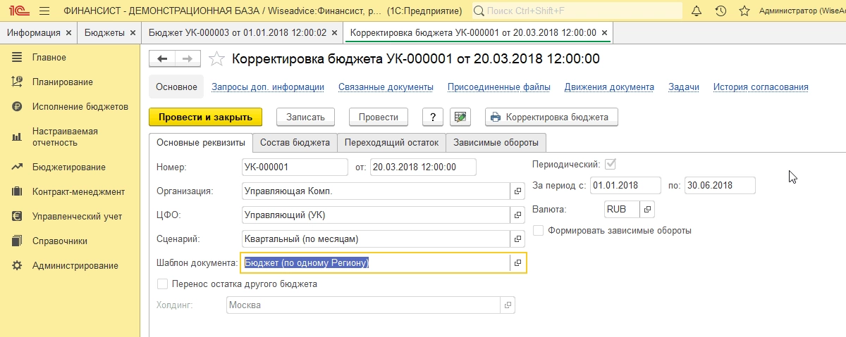 Документ «Корректировка бюджета» создается как напрямую из бюджета, так и отдельно в журнале документов «Корректировка бюджета» в подсистеме «Бюджетирование».