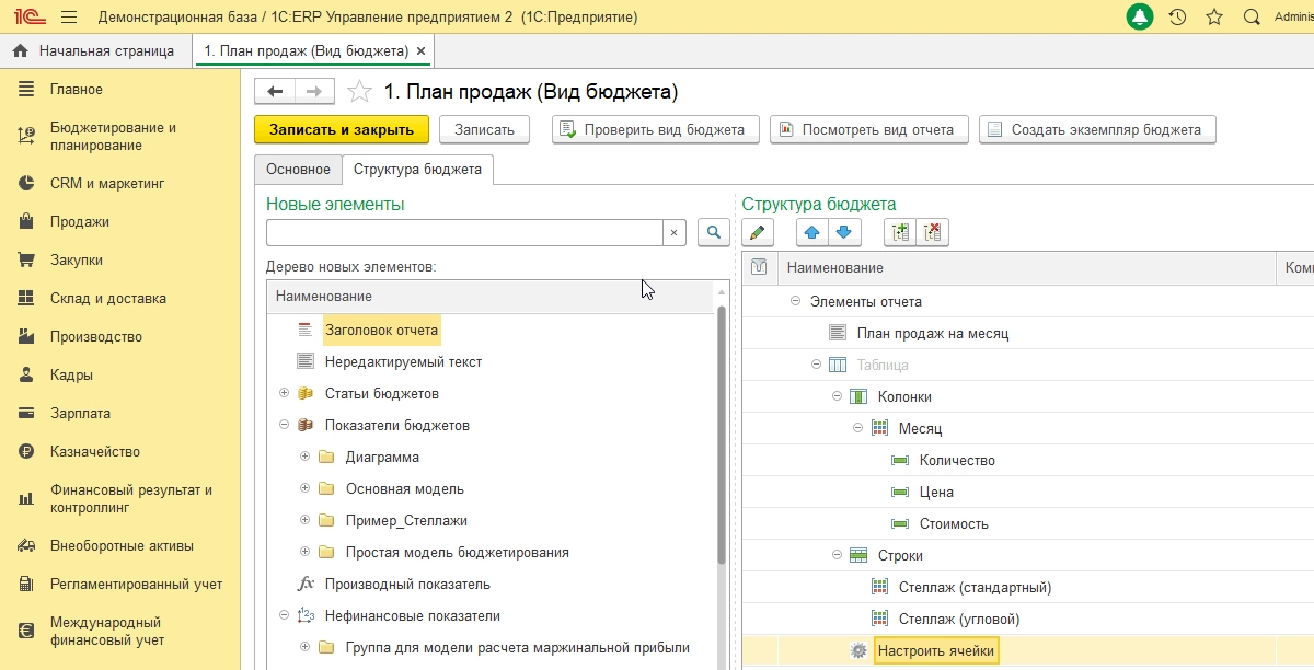 При создании вида бюджета на закладке «Основное» заполняются модель бюджетирования, способ планирования и т. д. На закладке «Структура бюджета» в левой части отражены все доступные статьи, показатели, аналитики. В правой части определяем, что будет указано в строках, что в колонках, а используя «Настроить ячейки», можно настроить правила расчета отдельно для каждой ячейки.