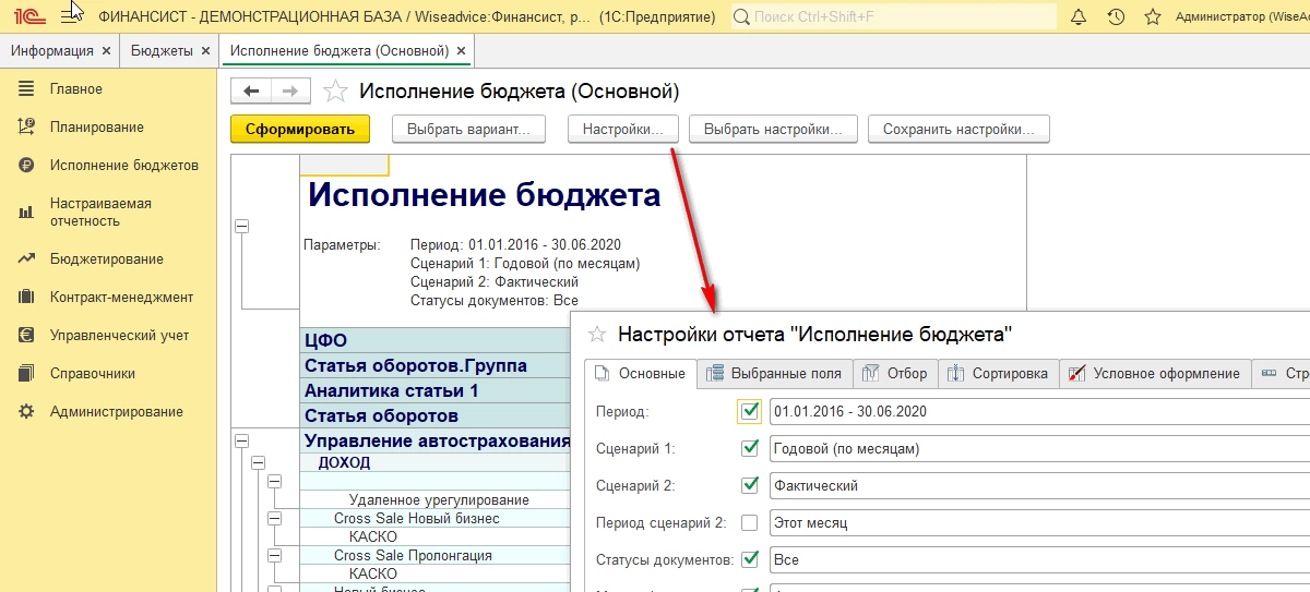 Отчет «Исполнение бюджета» служит для анализа данных бюджетов согласно настройкам отчета.