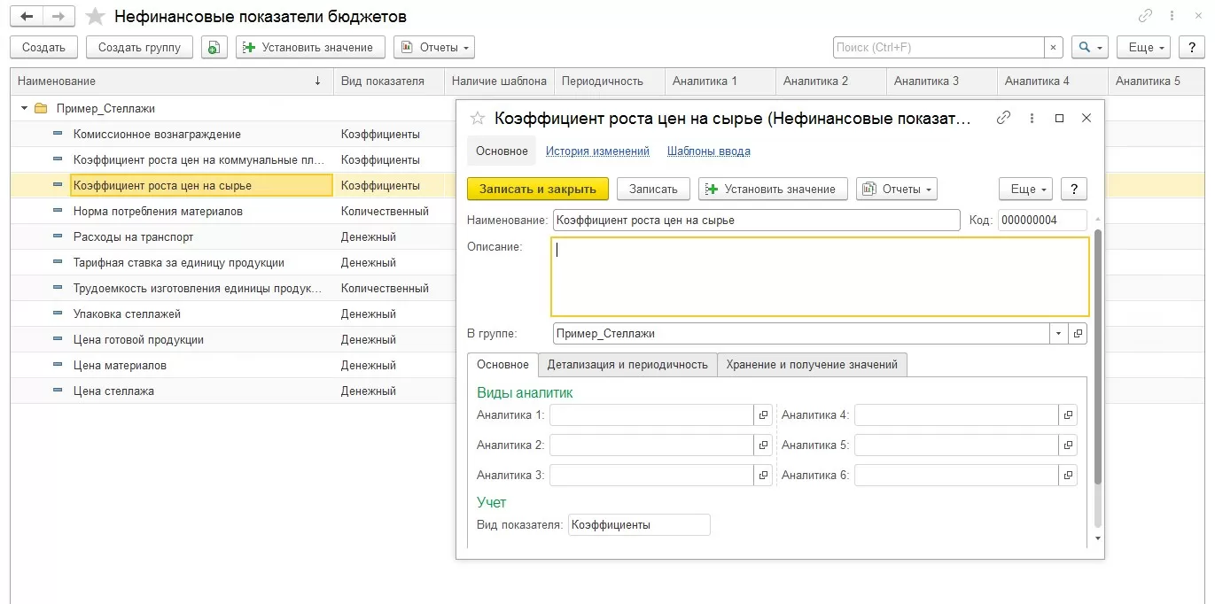 Справочник «Нефинансовые показатели» заполняется при необходимости. Данные показатели могут быть заложены в формулы, используемые при расчете (например, коэффициент, ставка).