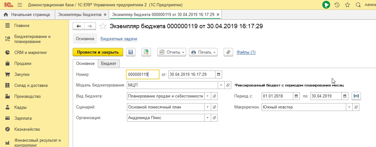 В 1С:ERP реализована возможность формирования модели бюджетирования, с возможностью формирования как по подразделениям, так и по организации в целом.