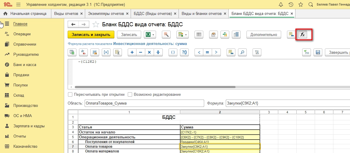 В Бланке отчета, при помощи кнопки «Отобразить ячейки формул» происходит настройка и редактирование формул расчета с возможностью использования текущего отчета, других отчетов. При настройке одного бланка можно обращаться к настройкам другого бланка, при этом для одного и того же Бланка использовать несколько правил расчета.