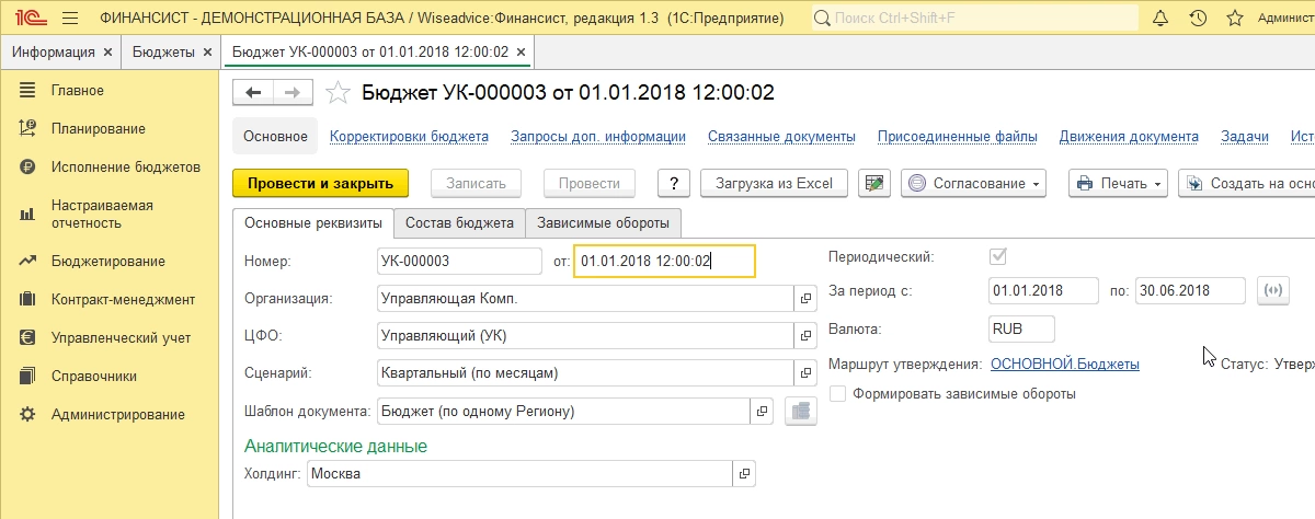 Документ «Бюджет» содержит плановые данные. В документе отражается движение по статьям за период, который определен периодичностью сценария.