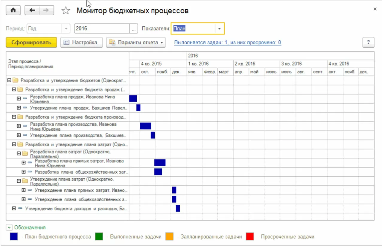 Рабочее место или группа отчетов, показывающих текущее состояние этапов бюджетного процесса и прогноз их выполнения. Одной из главных функций монитора является управление конфликтами при назначении нормативных сроков исполнения бюджетного процесса. При этом запланированные к выполнению этапы будут окрашены на диаграмме синим цветом, просроченные задачи – красным, а прогноз по выполнению этапов в будущем – желтым