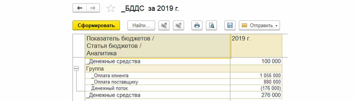 При условии, что связи выбранного показателя со статьями бюджетов установлены верно, Сумма конечного остатка будет равна начальному остатку плюс поступления денежных средств минус выбытия денежных средств.