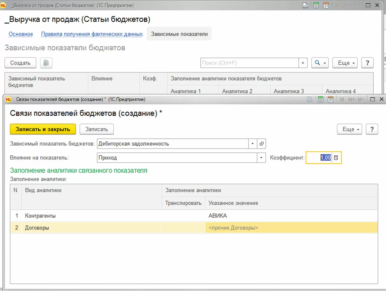 Зависимые показатели определяют влияние статей бюджетов на показатели бюджетов. Данная связь объектов подсистемы используется для формирования Прогнозного баланса на основании оборотов по статьям бюджетов.