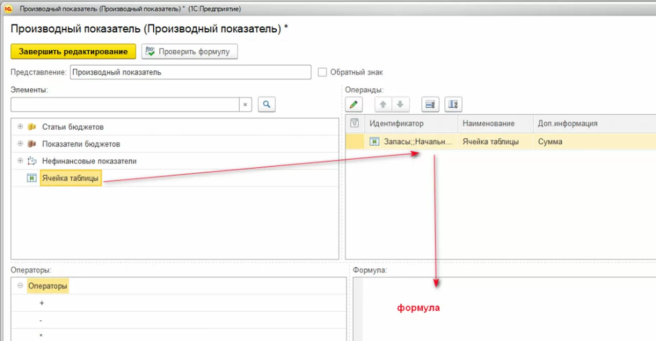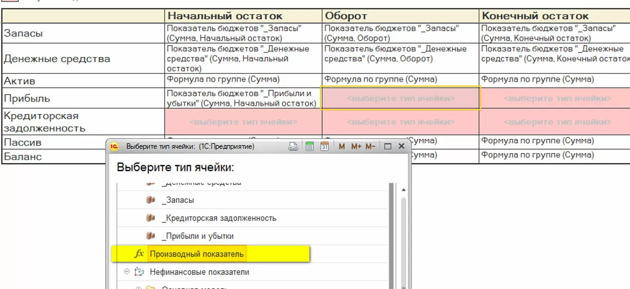 Для работы сложной таблицы необходимо заполнить все розовые поля, поэтому заполнение подобных таблиц наиболее трудозатратно. Преимуществом сложной таблицы является то, что при написании формул можно использовать не только статьи и показатели, а еще и данные ячеек создаваемой таблицы. Для написания формул с использованием ячеек необходимо воспользоваться производным показателем.